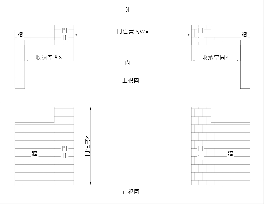 1.量測門柱實內(W) 2.量測收納空間(X、Y),決定收納方向 3.量測門柱高(Z),決定大門高度 請量測以上數據以便與業務人員討論